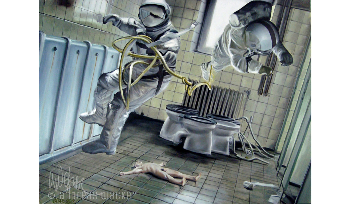 Zwei schwebende Astronauten auf einem desolaten Schülerklo und ein nackter älterer Mann auf dem Fliessenboden, übermächtig in ihrer Proportion über ihm in seiner Wehrlosigkeit kreisend, durch einen Sauerstoffschlauch miteinander verbunden, unkenntlich durch die verspiegelten Helme.